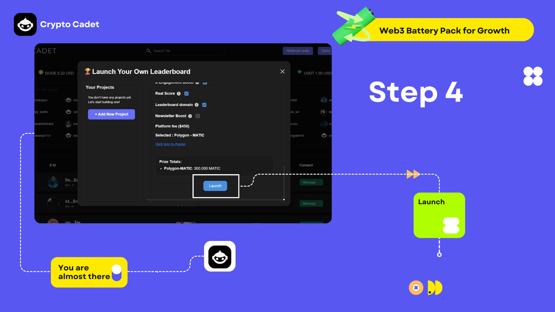 From your CryptoCadet V2 dashboard, select “Launch Leaderboard” from the sidebar. You’ll be prompted to create a new leaderboard project.